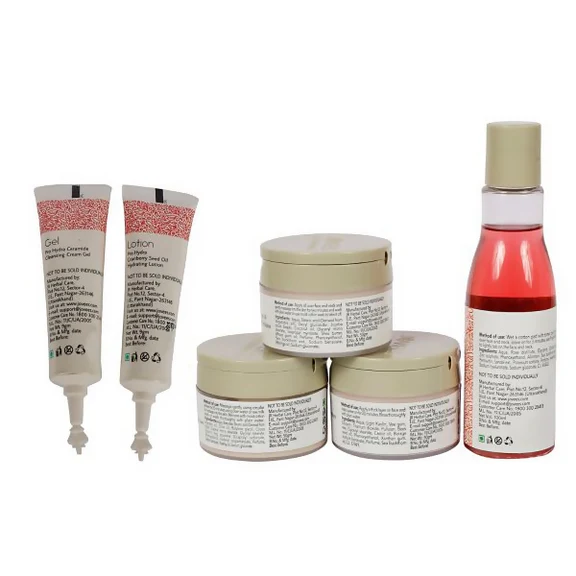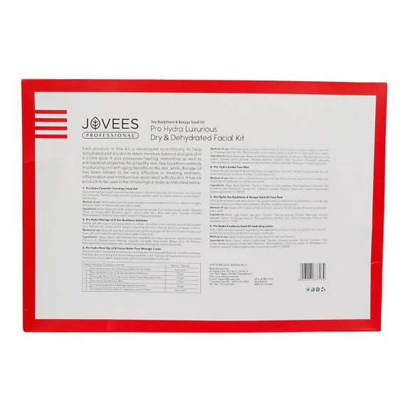 The kit contains: Jovees Professional Pro Hydra Ceramide Cleansing Cream Gel: 9 gm Pro Hydra Moringa Oil And Sea Buckthorn Exfoliator: 50 gm Pro Hydra Rosehip Oil And Cocoa Butter Face Massage Cream:50 gm Jovees Professional Pro Hydra Sandal Face Mist: 100 ml Pro Hydra Sea Buckthorn And Borage Seed Oil Face Pack: 50 gm Jovees Professional Pro Hydra Cranberry Seed Oil Hydrating Lotion: 9gm How To Use: It has six products to be used in the chronological order as indicated below: Step 1: Apply all over face and neck and gently massage for 3 to 5 minutes in circular motion. Wash thoroughly with plain water or remove with wet cotton swabs. Step 2: Apply all over face and neck and gently massage for 2 minutes. Wash thoroughly with plain water or remove with wet cotton swabs. Step 3:Use cream along with plain water or raw milk. Massage gently into the skin for 20 minutes using circular strokes. Wash thoroughly with plain water or remove with wet cotton swabs. Step 4:Wet a cotton pad with toner, use finger tips to lightly tab on the face and neck. Leave on for 3 minutes. Step 5:Apply a thick layer on face and neck. Leave on for 20 minutes. Rinse thoroughly with plain water. Step 6:Apply small quantity all over face and neck. Leave on. Legal Disclaimer: Product images are for illustrative purposes only. Images/packaging/ labels may vary from time to time due to changes made by the manufacturer's manufacturing batch and location. The product description is for information purposes only and may contain additional ingredients.