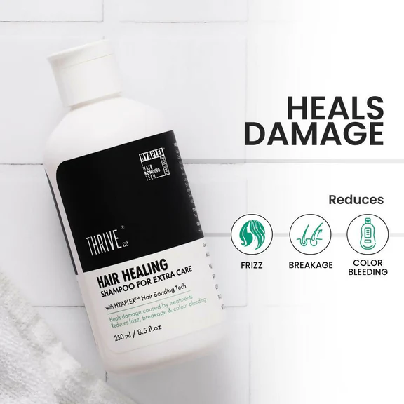 - The Thriveco Hair Healing Shampoo provides much-needed instant respite from frizz, breakage, and color bleeding. Best-In-Class Bond Repair Tech: Built with the latest, 3rd generation hair bond-building technology, Hyaplex(Tm) acts at the molecular level restoration of protein bonds in our hair. By rebuilding these broken bonds and sealing the cuticle, Hyaplex(Tm) repairs the damage from the inside out. Hydration: Thriveco Hair Healing Shampoo provides high moisture and hydration, causing less friction breakage. By sealing the cuticle, it also prevents moisture-loss reducing roughness.